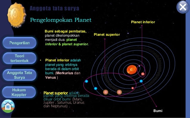 Manusia dan bumi hanyalah sebagian kecil dari elemen yang berada di jagat raya. Manusia adalah salah satu makhluk hidup yang tinggal di sebuah bintang yang bernama bumi. Urutan planet yang mengelilingi matahari antara lain planet merkurius, venus, bumi, mars, jupiter, saturnus, uranus, dan neptunus. Berikut pengertian tata surya dan anggotanya, dirangkum liputan6.com dari berbagai sumber, jumat(30/4/2021). Sistem tata surya adalah kumpulan benda yang ada di langit seperti planet, bintang, asteroid, satelit dan satelit bumi. Pembaca yang budiman, tata surya adalah sebuah nama diri/tempat, jadi aturan penulisannya t dan s di awal kata haruslah huruf besar. Saturnussaturnus adalah sebuah planet di tata surya yang dikenal juga sebagai planet bercincin, dan merupakan planet terbesar kedua di tata surya setelah jupiter. Matahari matahari adalah pusat tata surya, yang merupakan bintang sejati karena dapat memancarkan cahaya sendiri. Matahari adalah bintang yang berupa bola gas panas dan bercahaya yang menjadi pusat sistem tata surya.matahari memiliki empat lapisan yaitu inti matahari, fotosfer, kromosfer, dan korona. Salam geboy 18:09, 22 oktober 2008 (utc) catatan terjemahan. Semua sistem tata surya tersebut akan terbentuk sebuah sistem secara teratur serta semua objek yang ada dilangit akan terikat dengan gaya gravitasi. Ukuran diameternya antara 4.878 km lan 12.756 km, karo massa jenis antara 3,95 g/cm 3 lan 5,52 g/cm 3. Tata surya adalah kumpulan dari matahari, planet, dan benda langit lainnya.